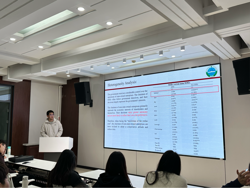 2022级金融学陶博雨同学分享了其论文《Superstition and Corporate Supply Chain Risk: Evidence from “Zodiac Year” Beliefs in China》的完整研究历程。他从独特的文化视角选题入手,详细介绍了指标构建、面板固定效应模型运用,以及稳健性检验、异质性分析与机制分析的全过程,并推荐了实用的研究软件与数据平台,为同学们提供了科研经验。