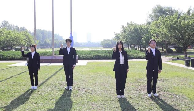 迎着朝阳,国旗护卫队队员身姿挺拔、步伐铿锵,护送国旗走向升旗台。当《义勇军进行曲》激昂的旋律划破晨空,全体师生庄严肃立,齐声高唱国歌,目光紧紧追随五星红旗冉冉升起,每一位在场的师生心中激荡着对祖国的无限崇敬与热爱。